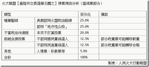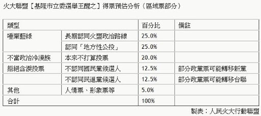 王醒之大膽推測,明天選舉火盟的總票數,原本不投票而被重新召喚火苗的、以及拒絕繼續「含淚/含恨投票」從藍綠陣營釋放出來的,約佔了一半;而火盟此次選戰主軸「地方性公投,小市民做主」也成功地吸引了新的認同者(如下表)。